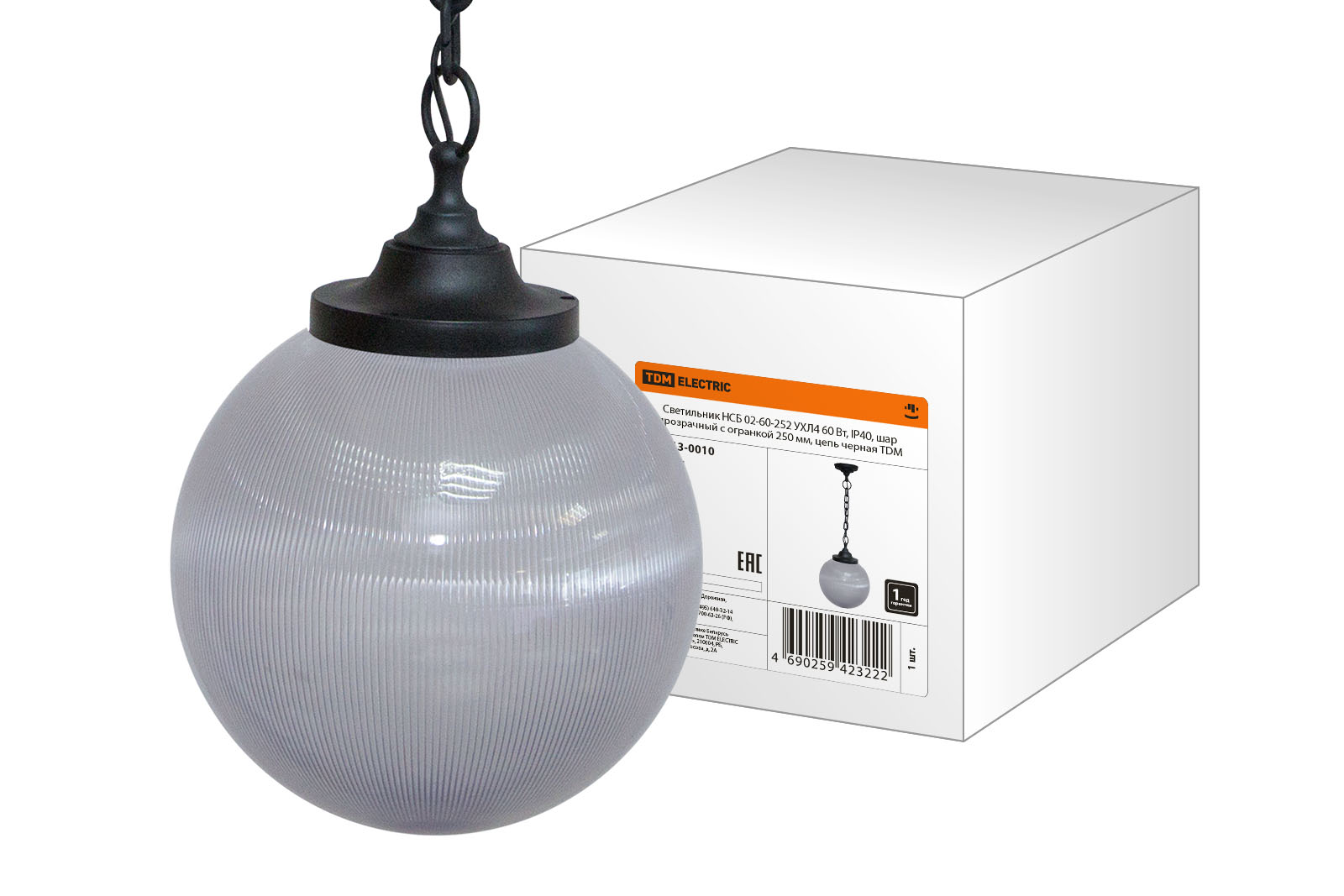 Наименование: Светильник НСБ 02-60-252 УХЛ4 60 Вт, IP40, шар прозрачный с огранкой 250 мм, цепь черная TDM