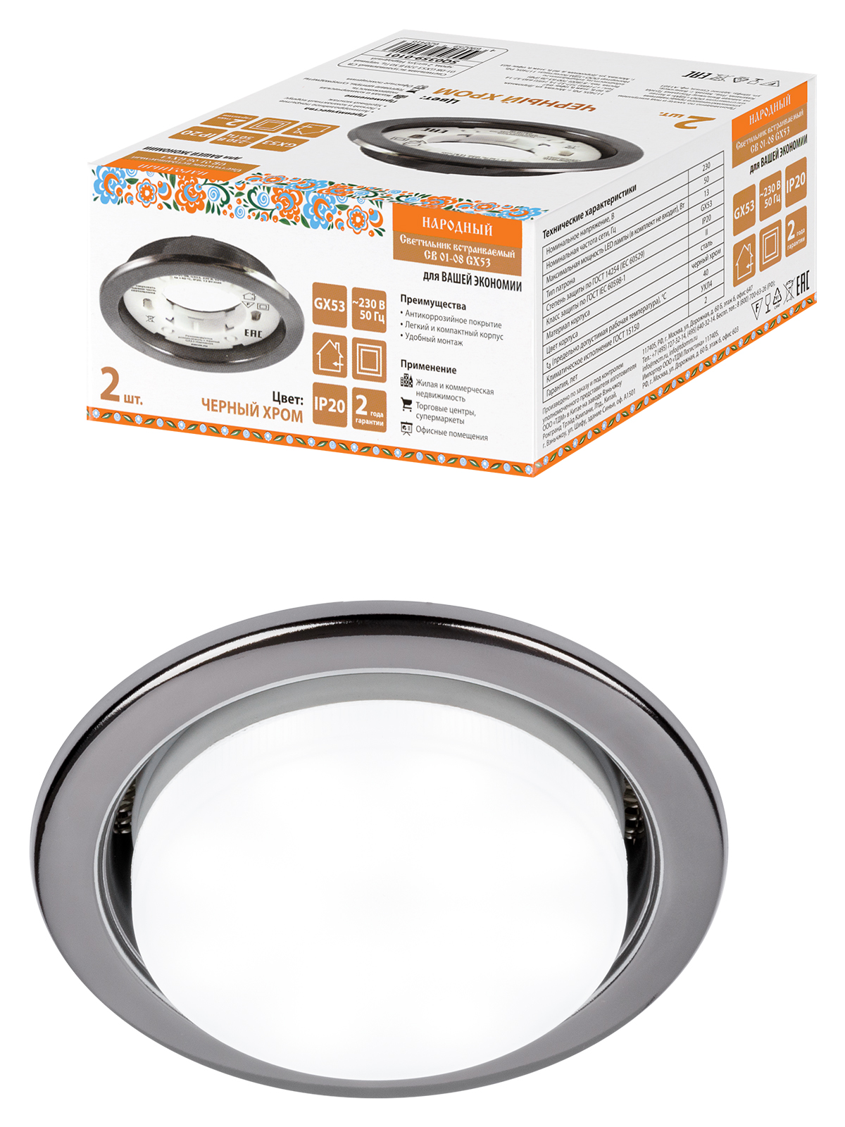 Наименование: Светильник встраиваемый СВ 01-08 GX53 220 В 50 Гц, черный хром, 2 шт/уп, Народный