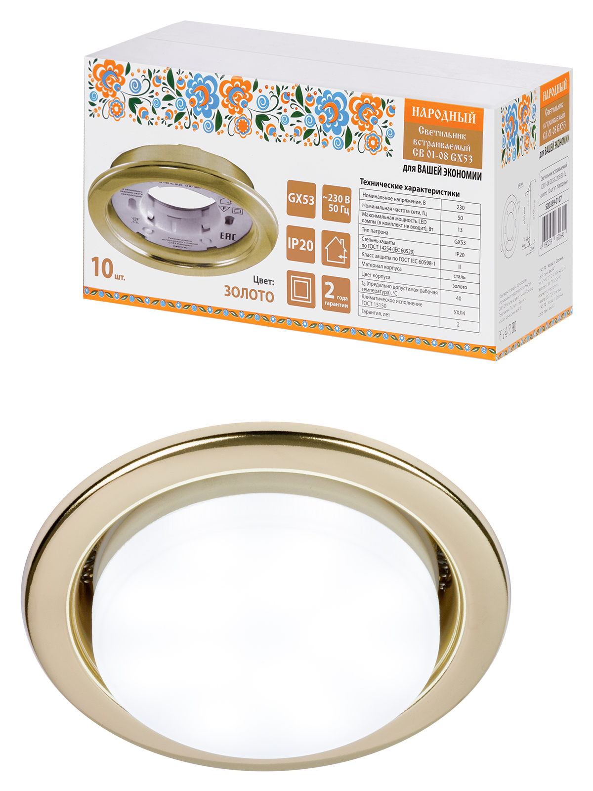 Наименование: Светильник встраиваемый СВ 01-08 GX53 220 В 50 Гц, золото, 10 шт/уп, Народный
