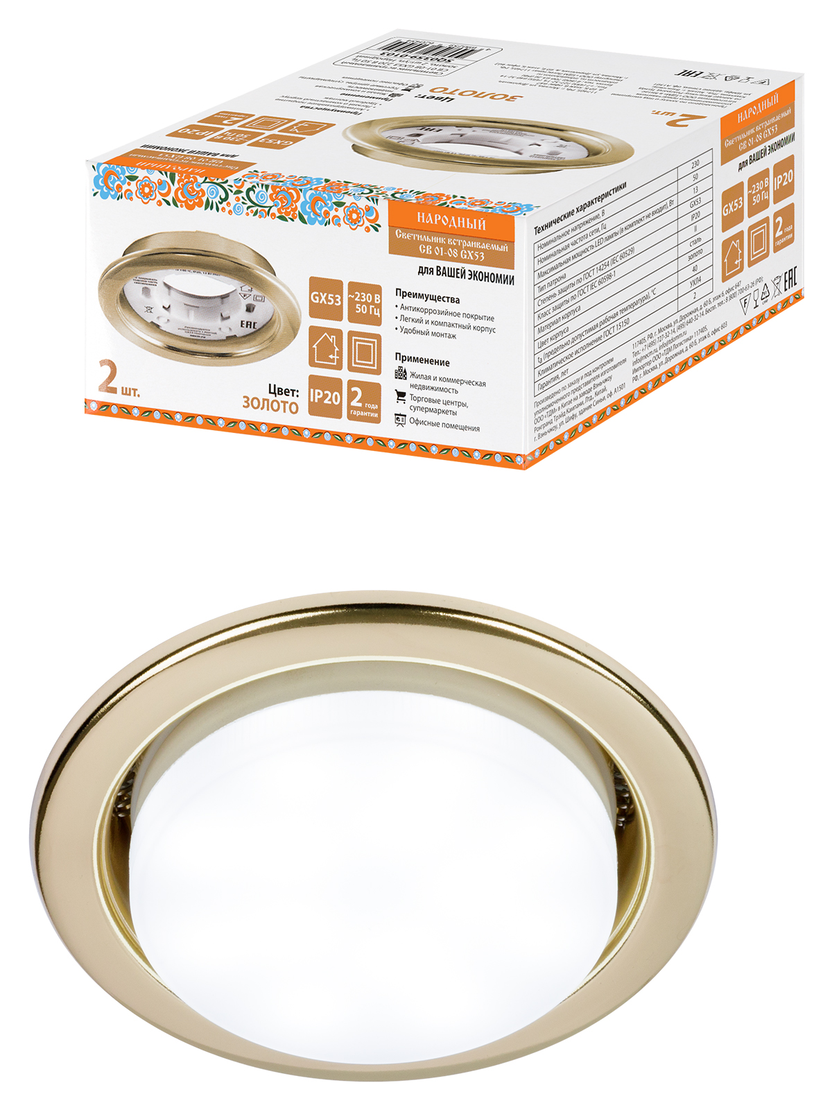 Наименование: Светильник встраиваемый СВ 01-08 GX53 220 В 50 Гц, золото, 2 шт/уп, Народный