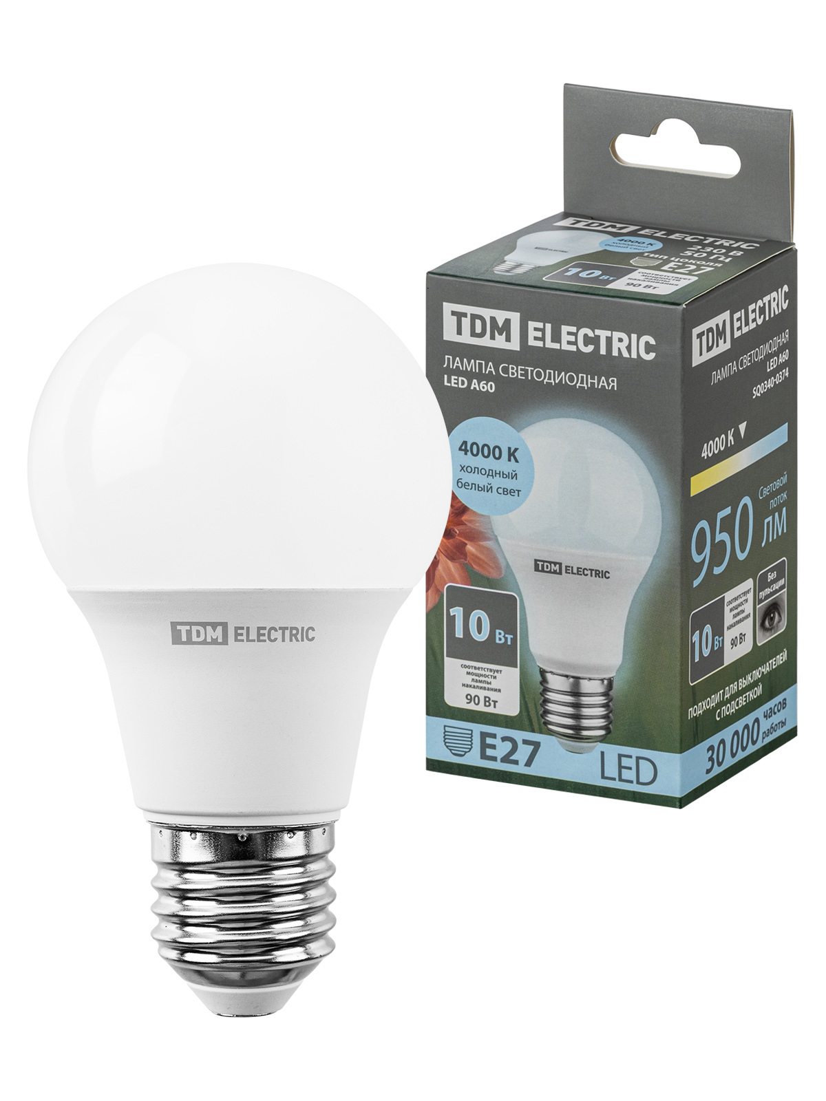 Наименование: Лампа светодиодная А60 10 Вт, 230 В, 4000 К, E27 TDM