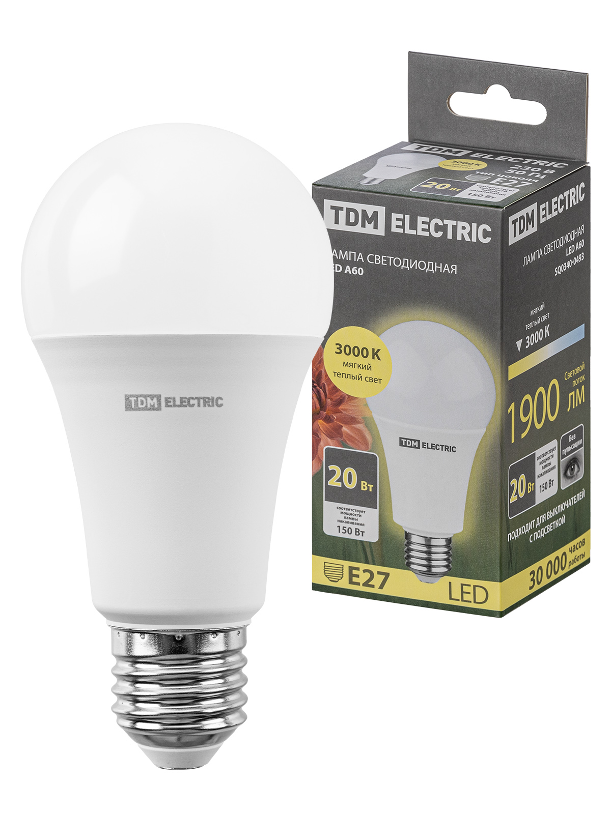 Наименование: Лампа светодиодная А60 20 Вт, 230 В, 3000 К, E27 TDM