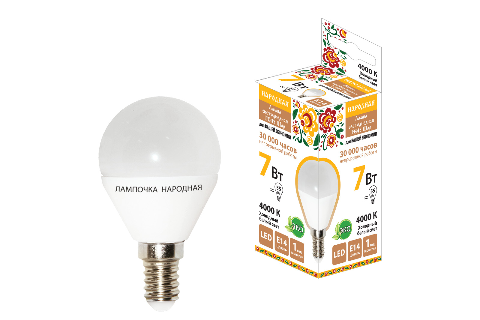 Наименование: Лампа светодиодная FG45-7 Вт-230 В-4000 К–E14 Народная