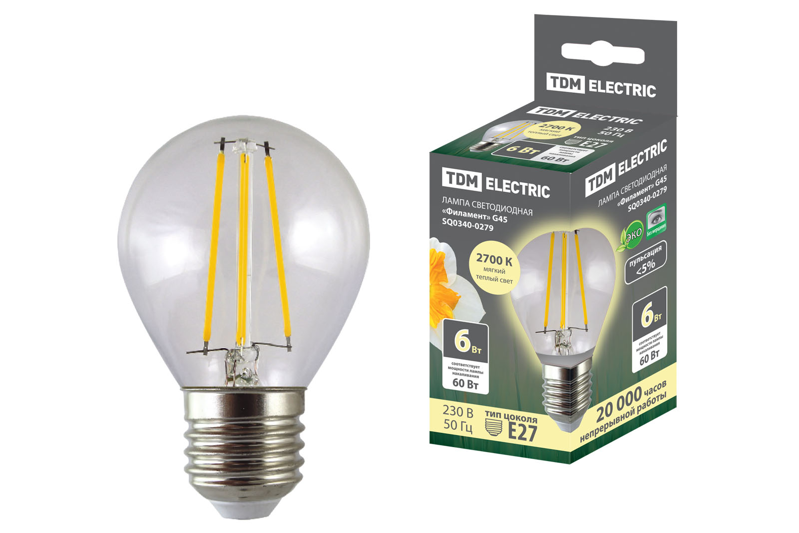 Наименование: Лампа светодиодная "Филамент" G45-6 Вт-230 В-2700 К–E27 TDM