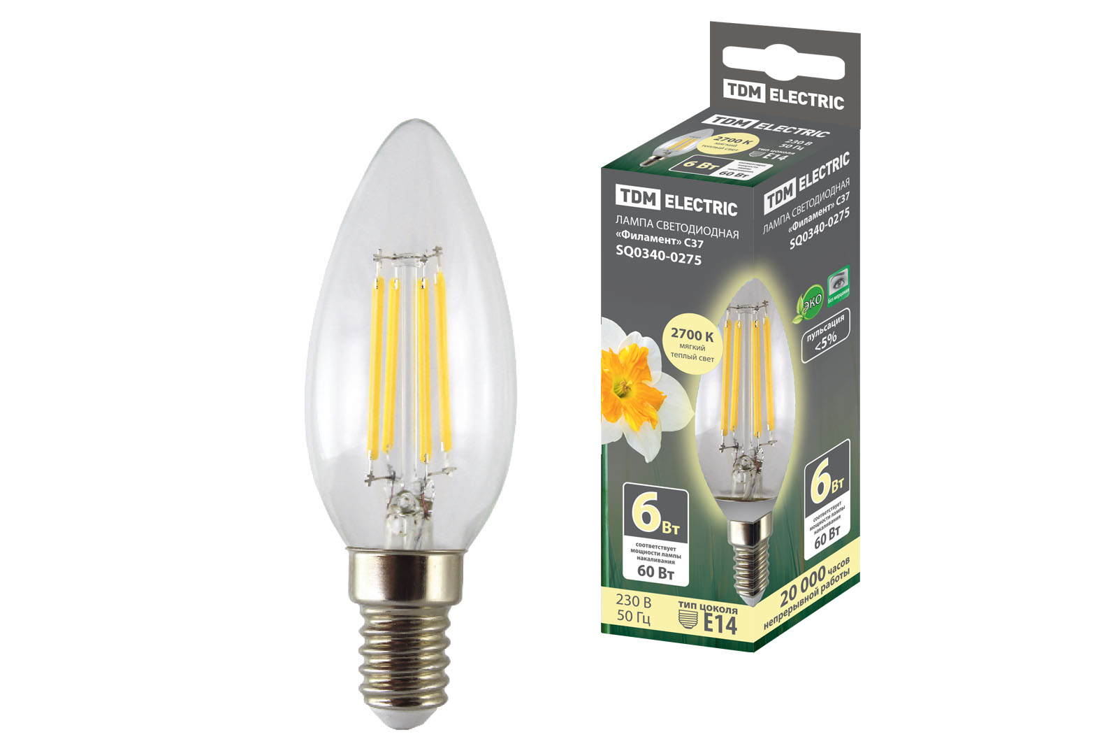 Лампа светодиодная "Филамент" С37-6 Вт-230 В-2700 К–E14 TDM