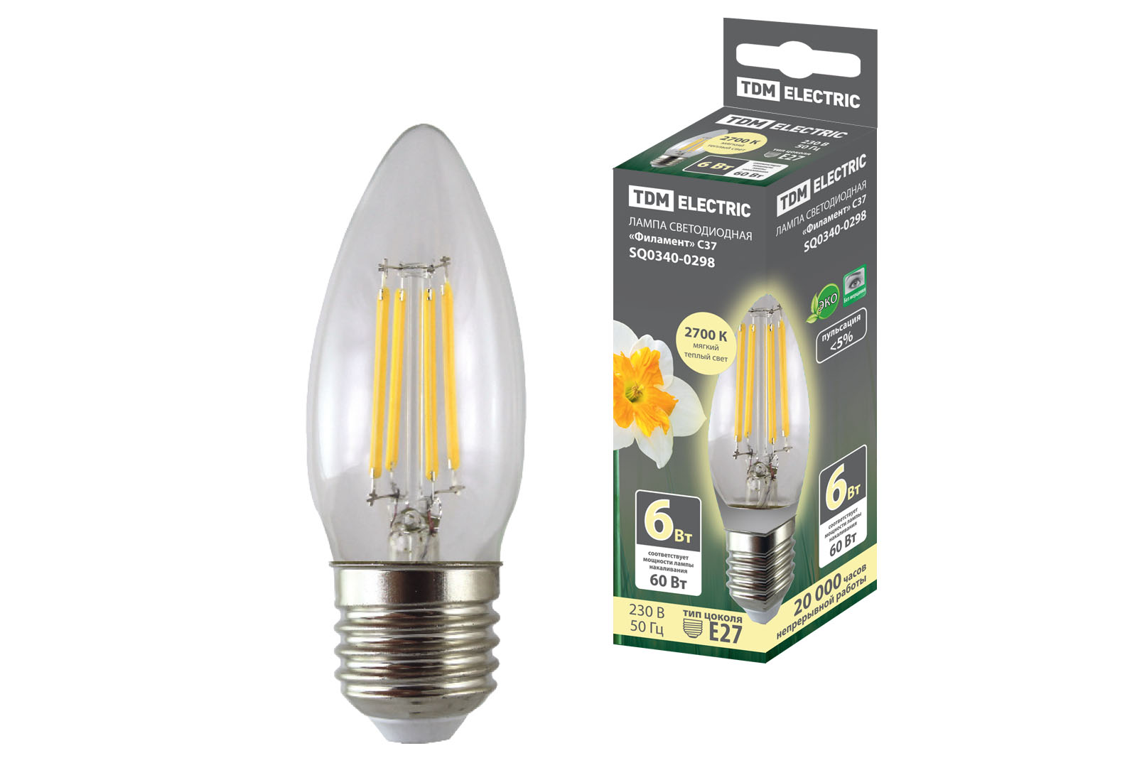 Лампа светодиодная "Филамент" С37-6 Вт-230 В-2700 К–E27 TDM