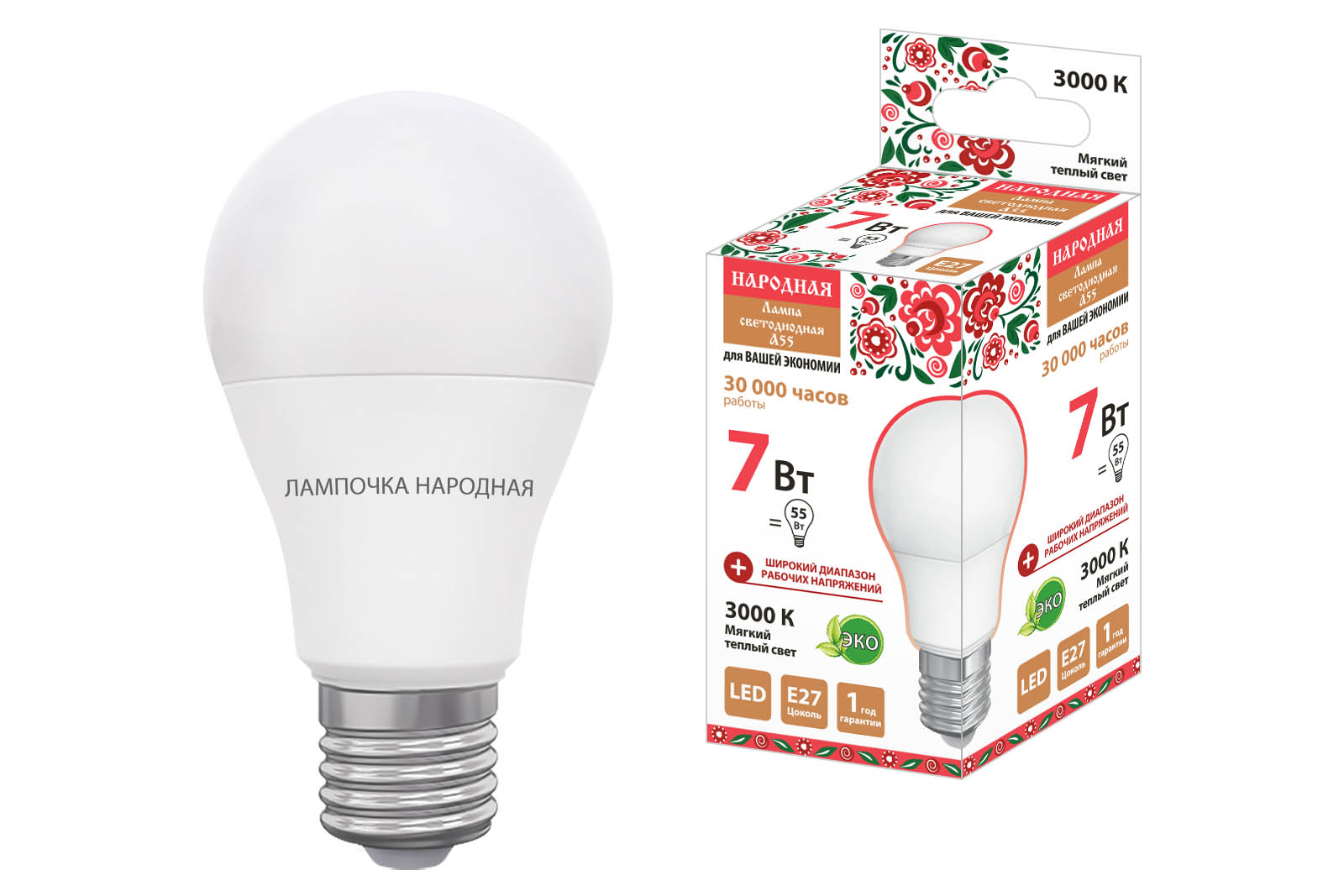 Наименование: Лампа светодиодная НЛ-LED-A55-7 Вт-230 В-3000 К-Е27, (55x98 мм), Народная