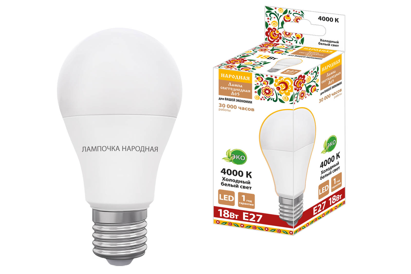 Наименование: Лампа светодиодная НЛ-LED230-A65-18 Вт-230 В-4000 К-Е27, (65х128 мм), Народная