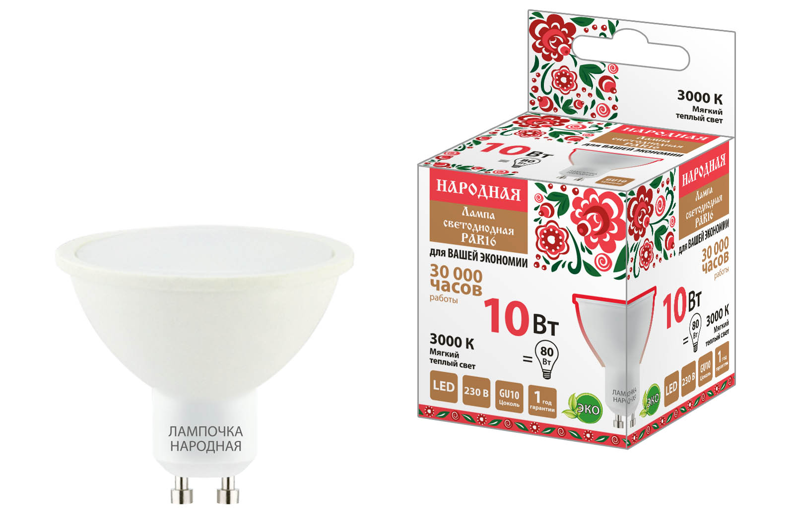 Наименование: Лампа светодиодная PAR16 10 Вт, 230 В, 3000 К, GU10 Народная