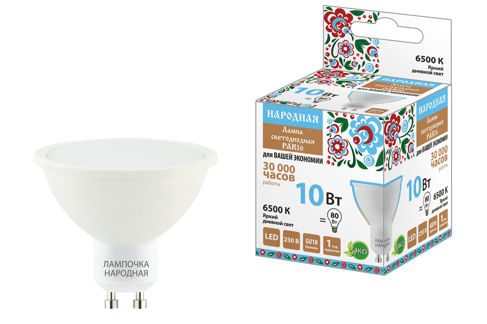 Наименование: Лампа светодиодная PAR16 10 Вт, 230 В, 6500 К, GU10 Народная