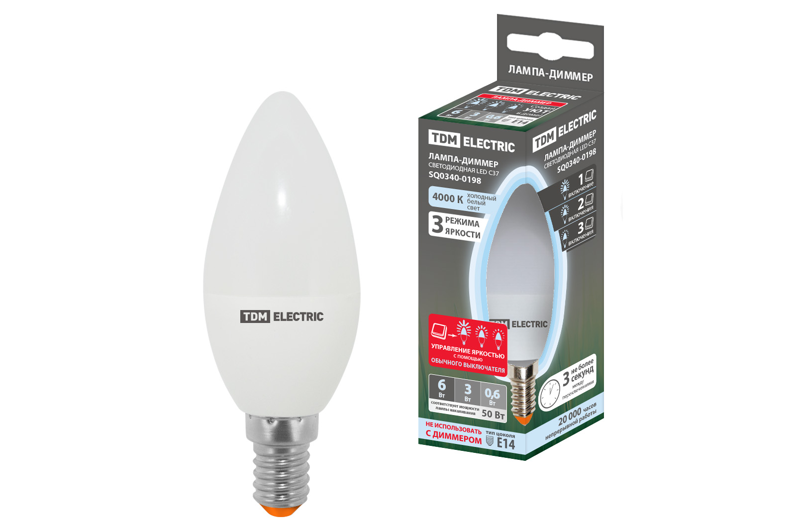 Наименование: Лампа светодиодная С37-6 Вт-230 В-4000 К–E14 "Лампа-ДИММЕР" TDM