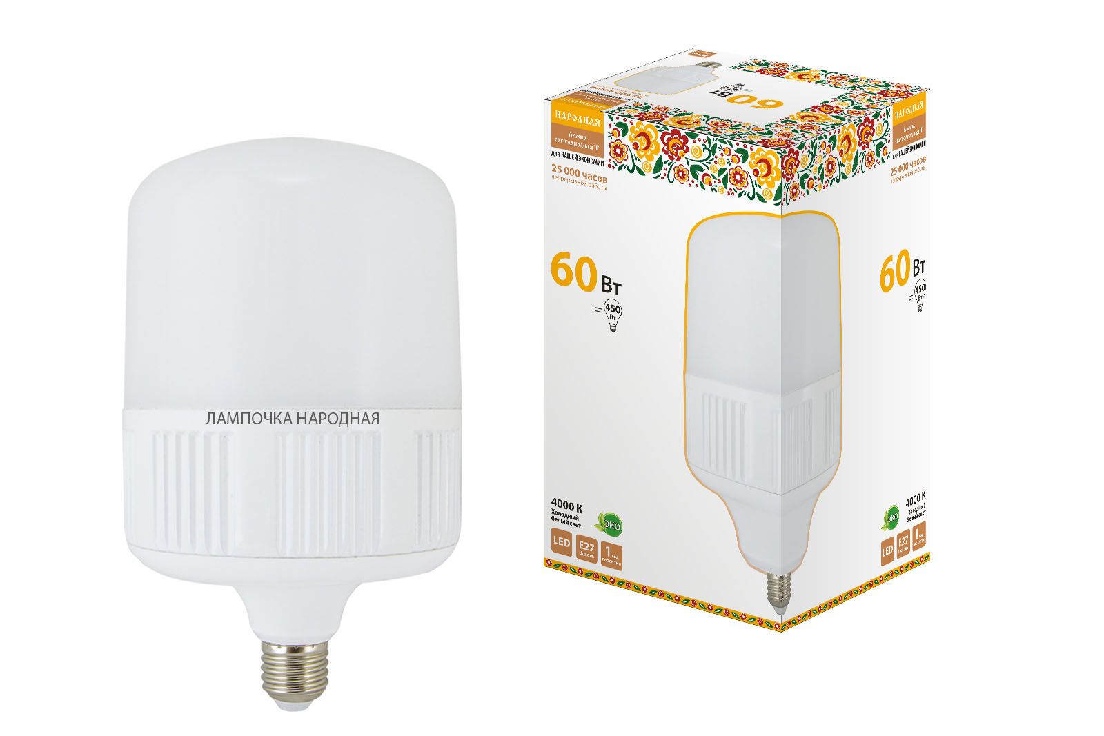 Наименование: Лампа светодиодная T-60 Вт-230 В-4000 К–E27 (160x265 мм) НАРОДНАЯ