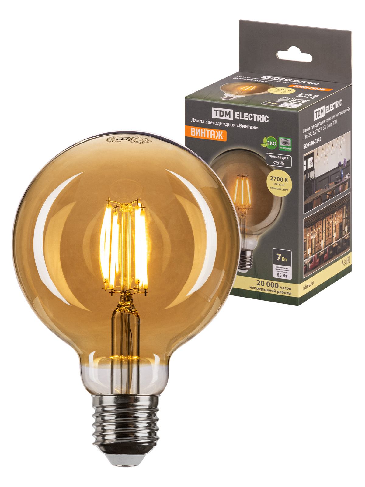 Наименование: Лампа светодиодная «Винтаж» золотистая G95, 7 Вт, 230 В, 2700 К, E27 (шар) TDM