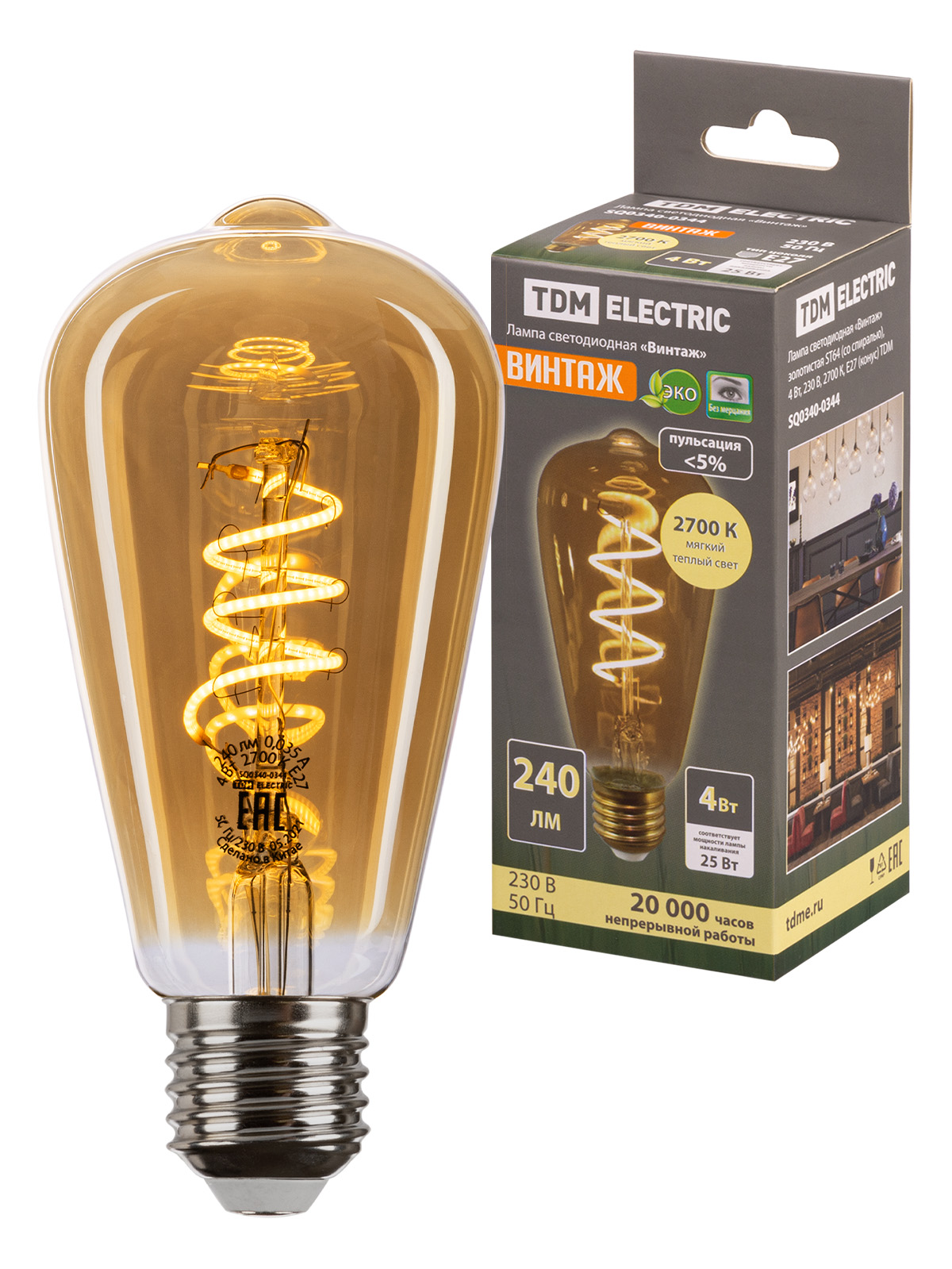 Наименование: Лампа светодиодная «Винтаж» золотистая ST64 (со спиралью), 4 Вт, 230 В, 2700 К, E27 (конус) TDM