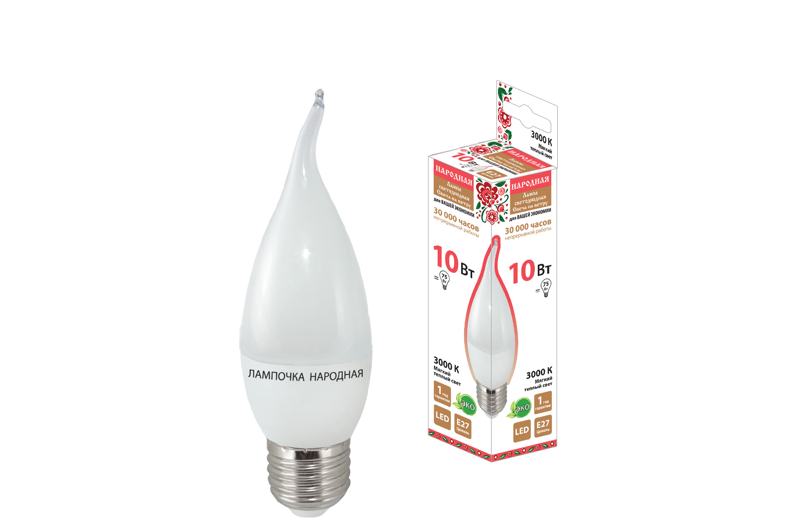Лампа светодиодная WFC37-10 Вт-230 В-3000 К–E27 (свеча на ветру) Народная