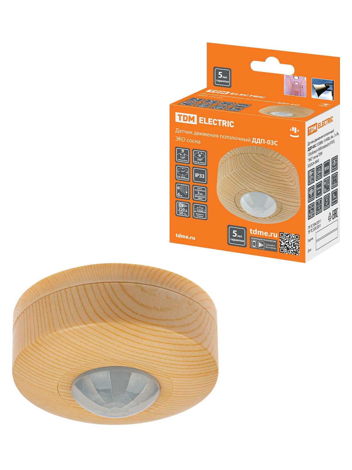 Наименование: Датчик движения потол. ДДП-03С (1200Вт, 10-900с, 6м , 3+Лк, 120(сб)+360(св)гр IP33), "ЭКО" сосна TDM