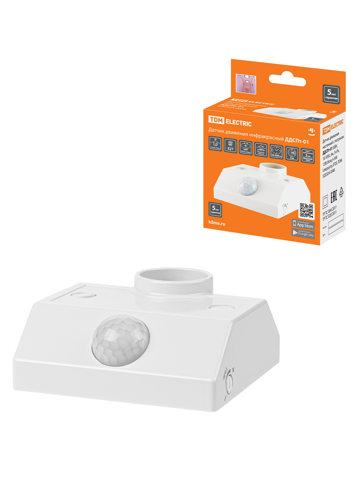 Наименование: Датчик движения стена с патр. ДДСПт-01 60Вт, 10-300с, 6м, 3+Лк, 120(сбоку)+360(сверху)гр, IP20, TDM