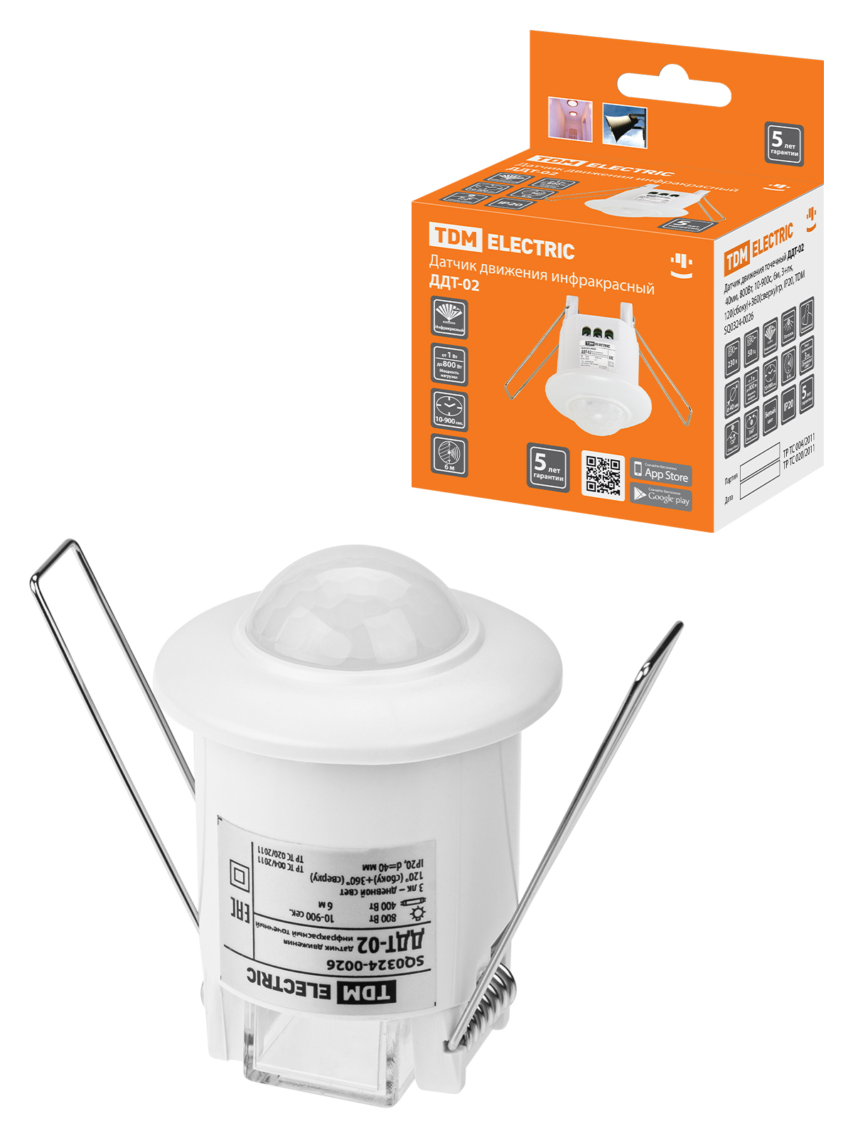 Наименование: Датчик движения точечный ДДТ-02 40мм, 800Вт, 10-900с, 6м, 3+лк, 120(сбоку)+360(сверху)гр, IP20, TDM