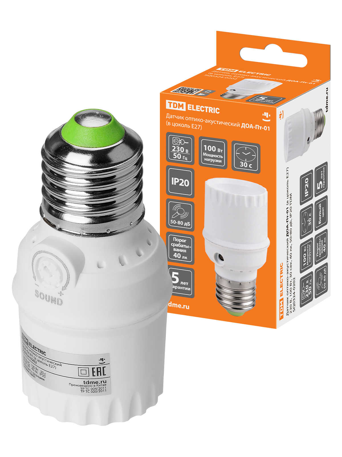 Наименование: Датчик оптико-акустический ДОА-Пт-01 (в цоколь Е27) 230 В, 100 Вт, 30 сек, 40 лк, 50-80 дБ, IP20 TDM