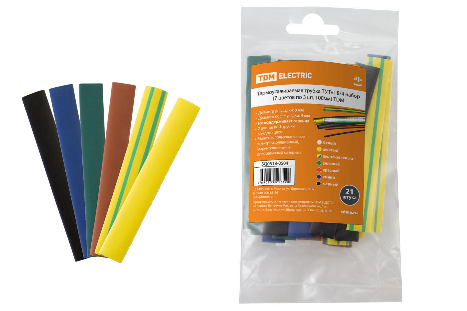 Наименование: Термоусаживаемая трубка ТУТнг 8/4 набор (7 цветов по 3 шт. 100мм) TDM