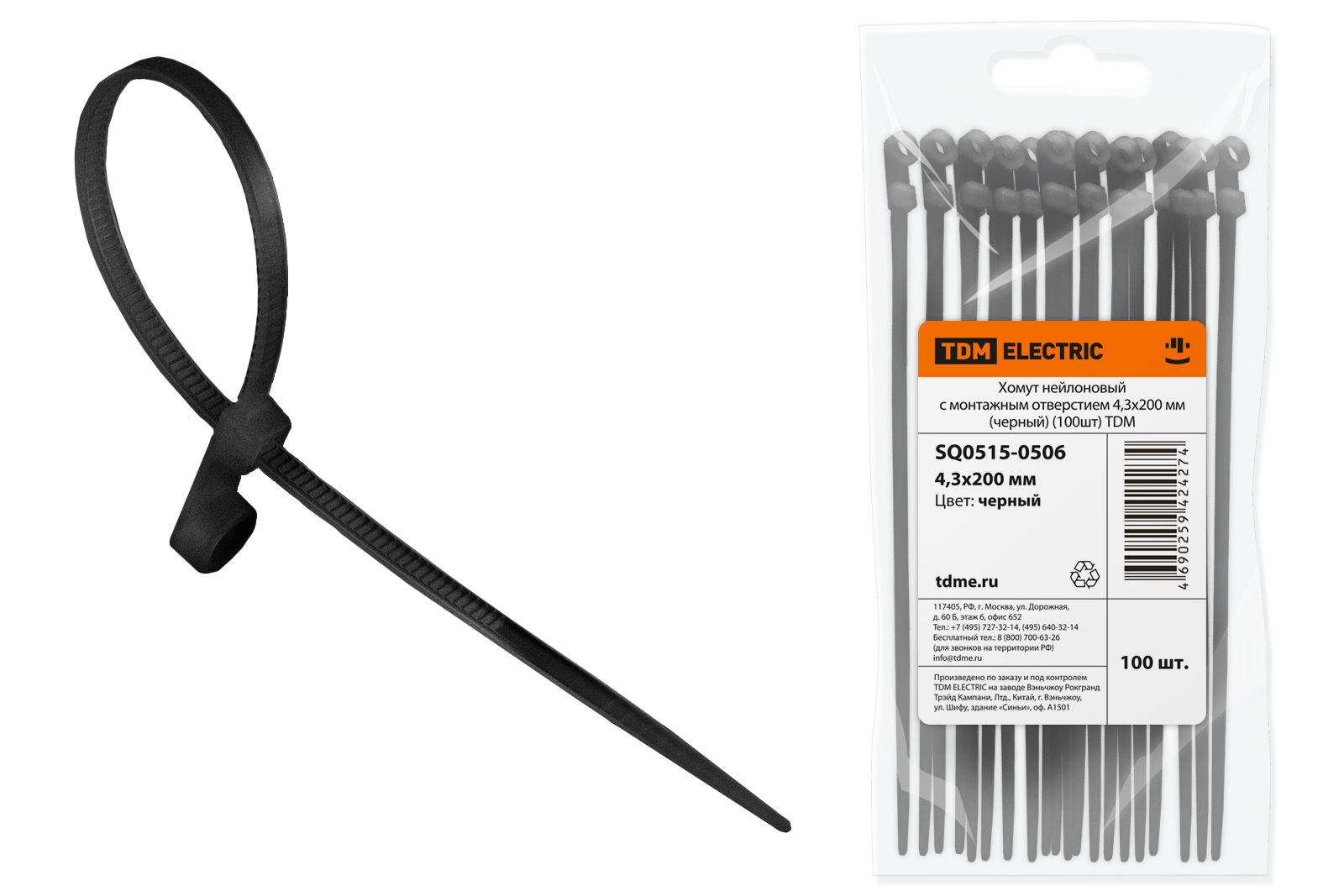 Наименование: Хомут нейлоновый с монтажным отверстием 4,3х200 мм (черный) (100шт) TDM
