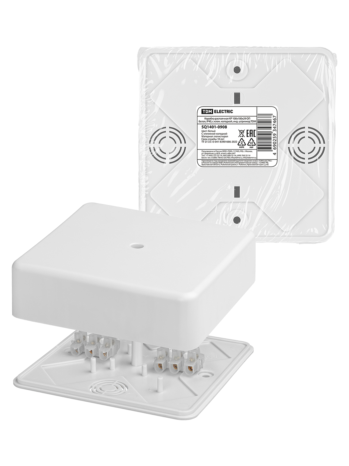 Наименование: Коробка распаячная КР 100х100х29 ОП белая, IP40, с клем. колодкой, инд. штрихкод TDM