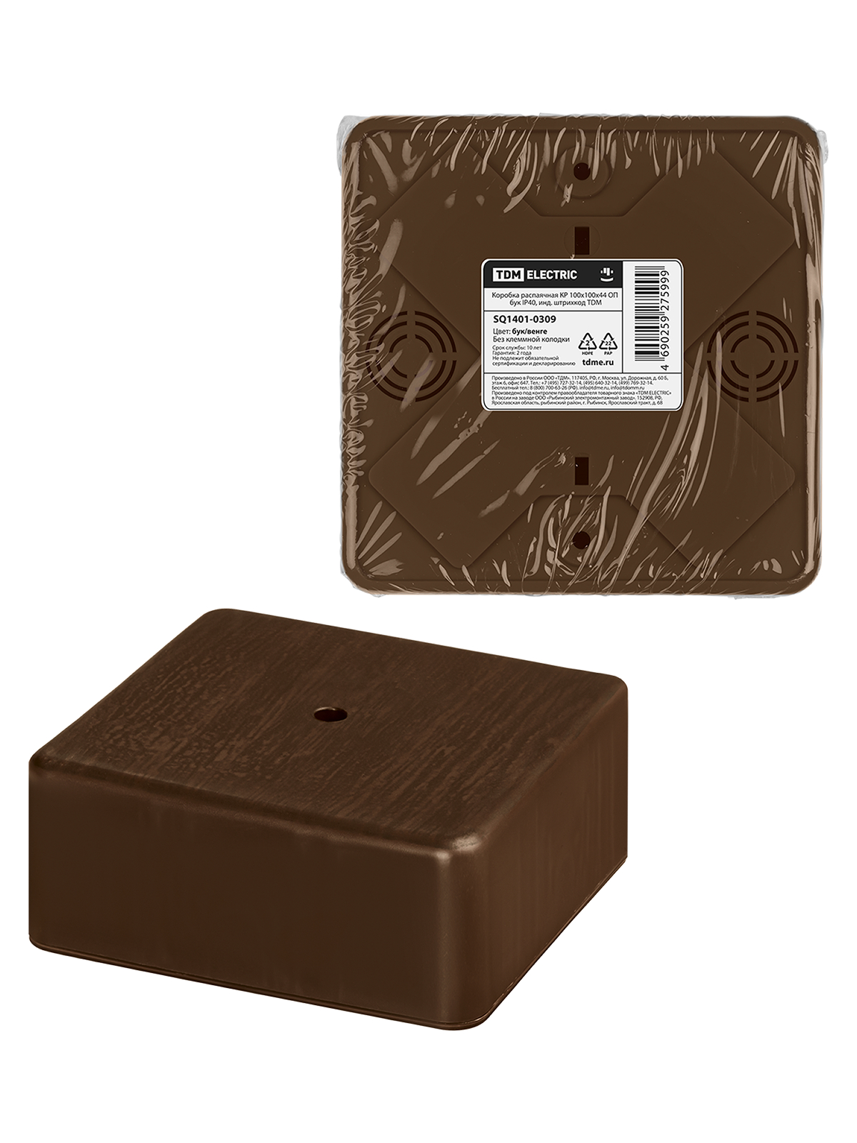 Наименование: Коробка распаячная КР 100х100х44 ОП бук IP40, инд. штрихкод TDM