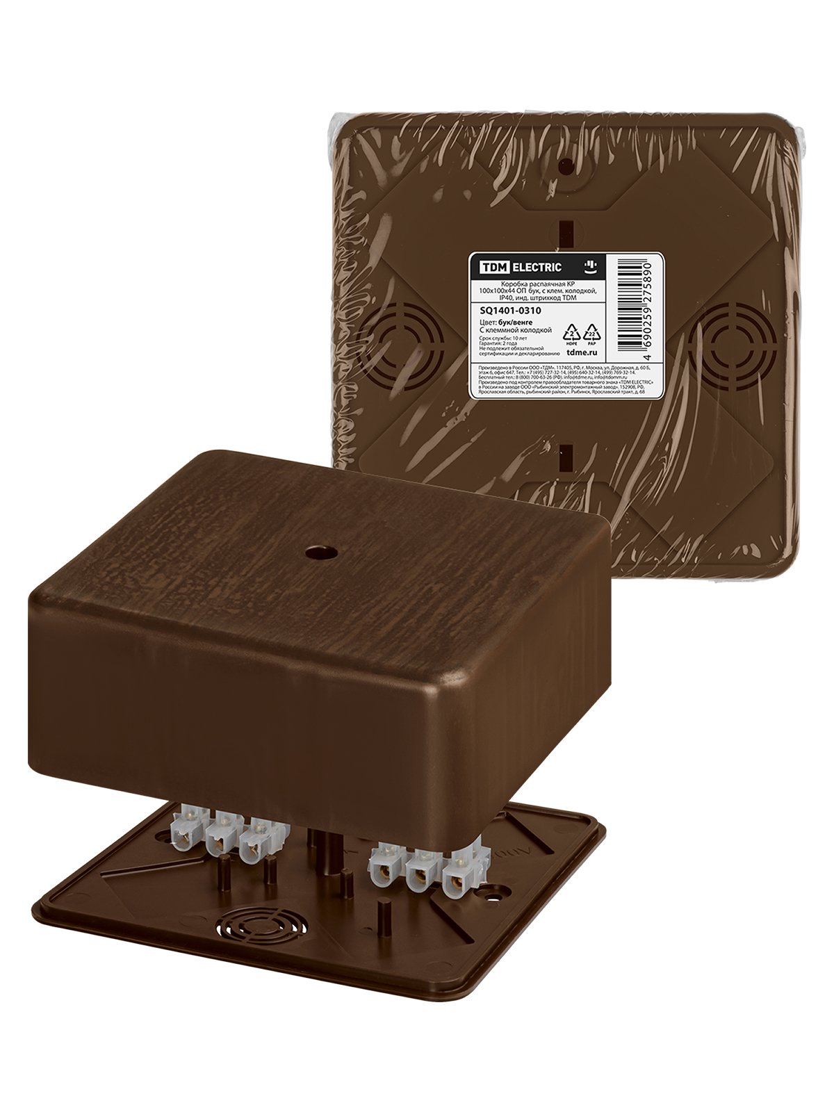 Наименование: Коробка распаячная КР 100х100х44 ОП бук, с клем. колодкой, IP40, инд. штрихкод TDM