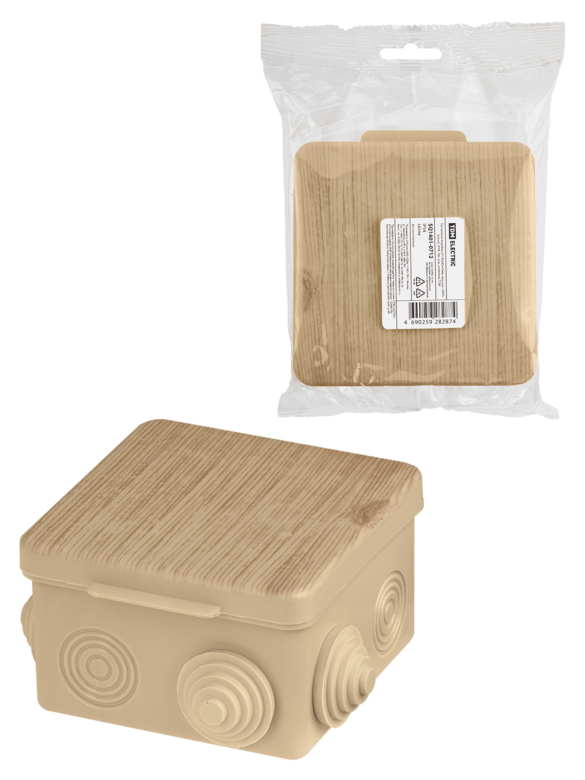 Наименование: Распаячная коробка ОП 80х80х50мм, крышка, "ЭКО" (сосна), IP54, 7вх. инд. штрихкод TDM