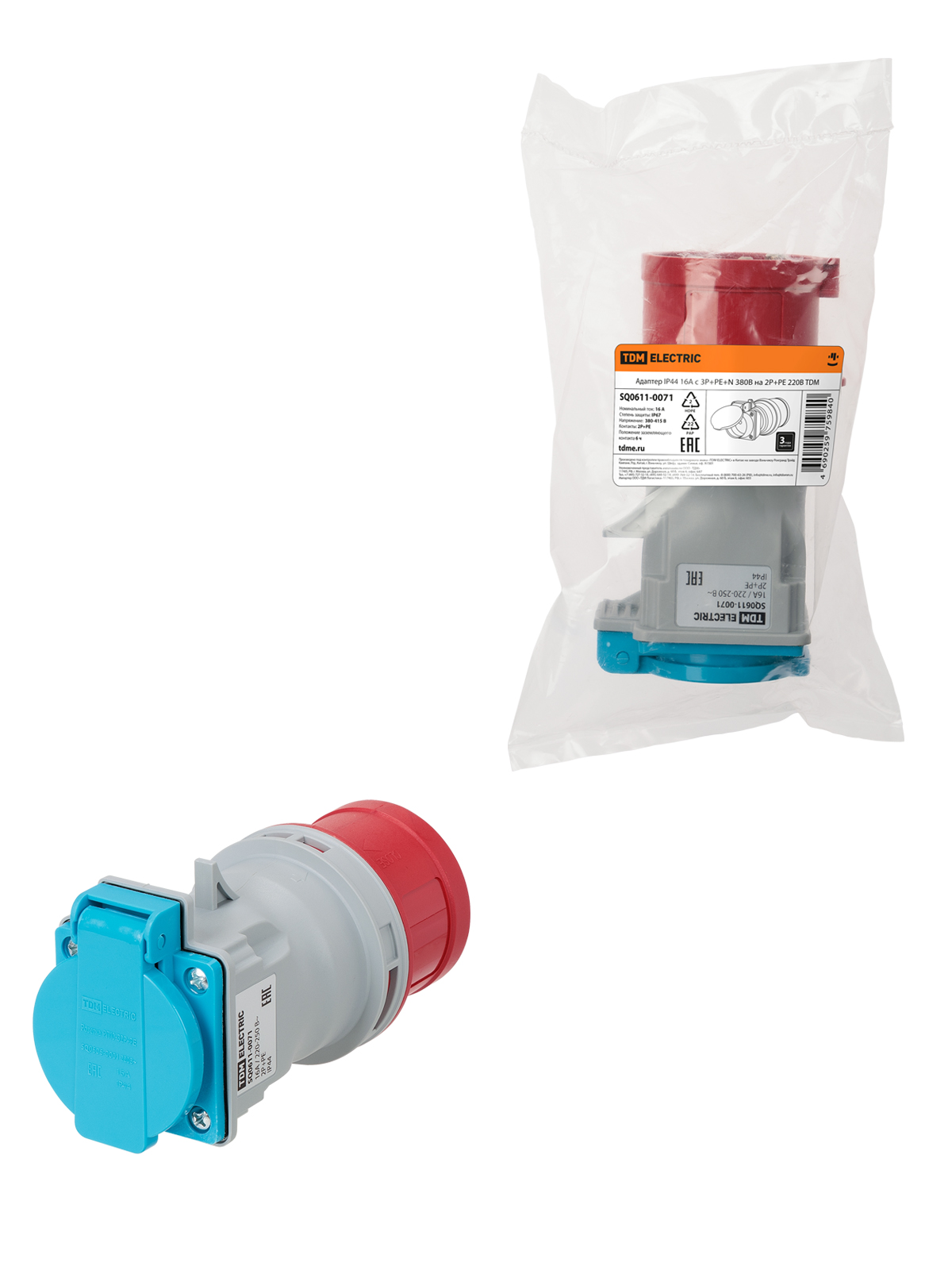 Наименование: Адаптер IP44 16A с 3Р+PЕ+N 380В на 2Р+PЕ 220В TDM