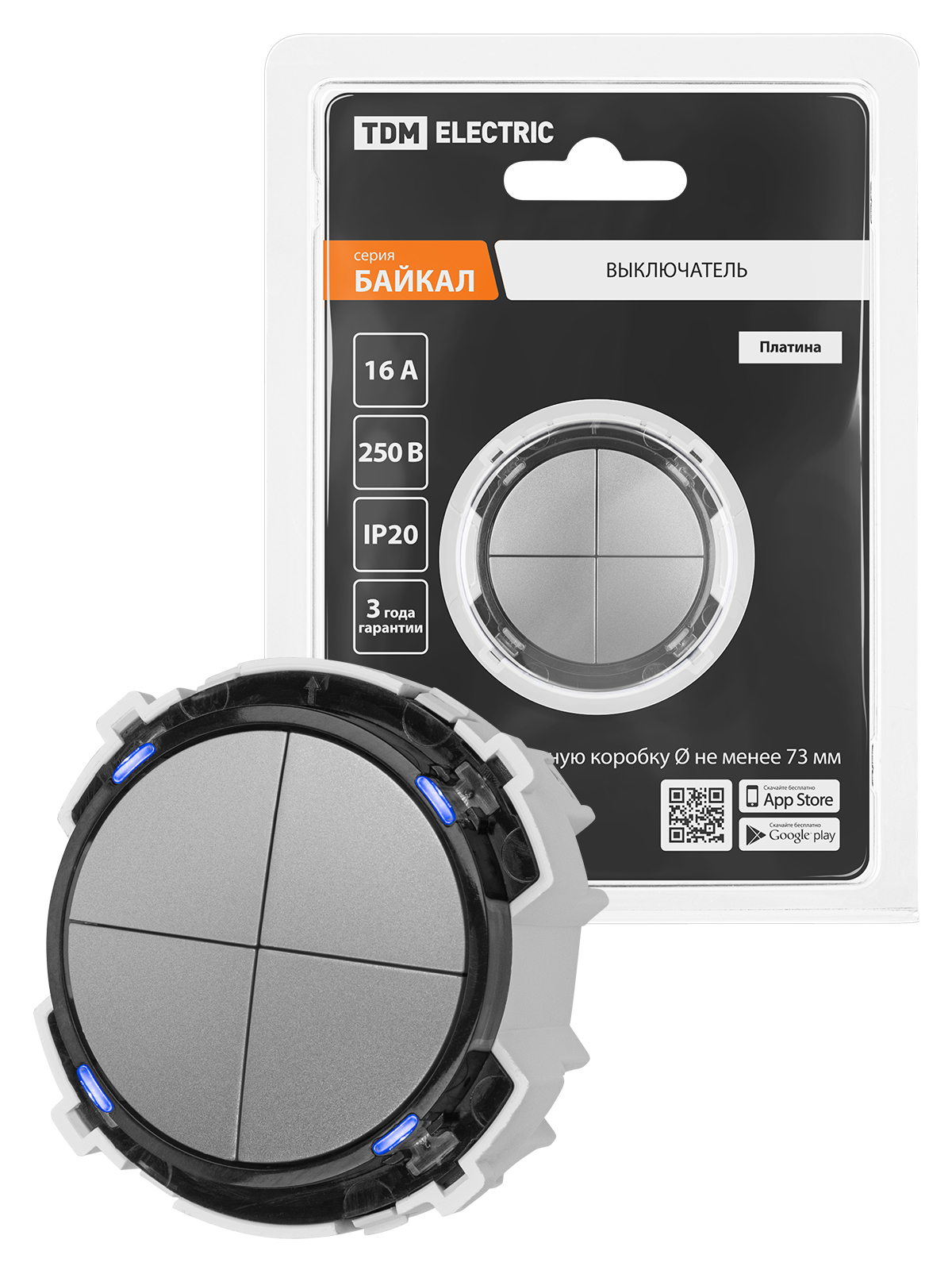 Наименование: Выключатель 4-кл. 16А 250В кнопочный механизм платина, "Байкал" TDM