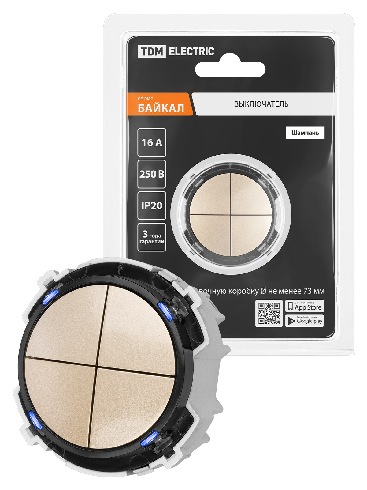 Наименование: Выключатель 4-кл. 16А 250В кнопочный механизм шампань, "Байкал" TDM