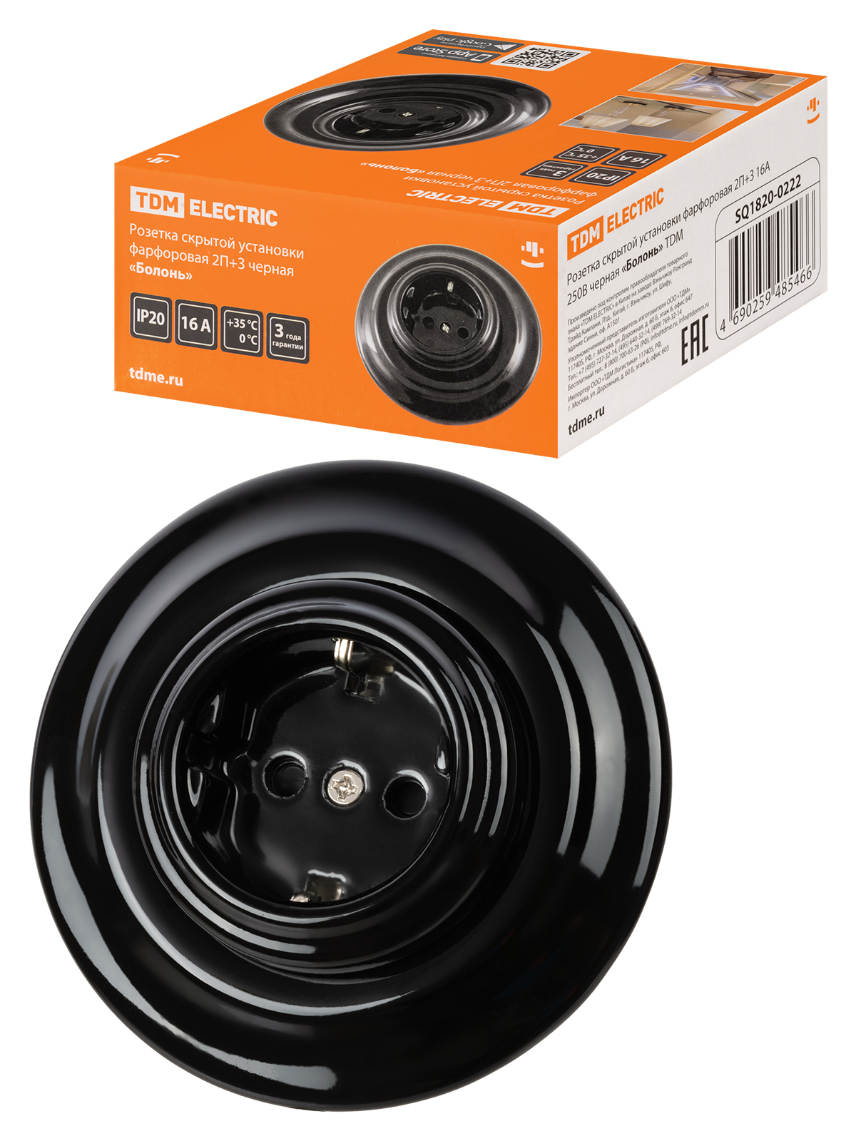 Наименование: Розетка скрытой установки фарфоровая 2П+З 16А 250В черная «Болонь» TDM
