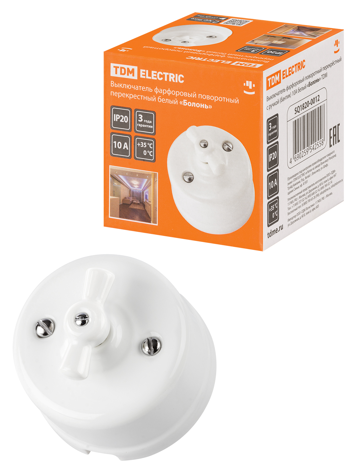 Наименование: Выключатель фарфоровый поворотный перекрёстный с ручкой (бантик) 10А белый «Болонь» TDM