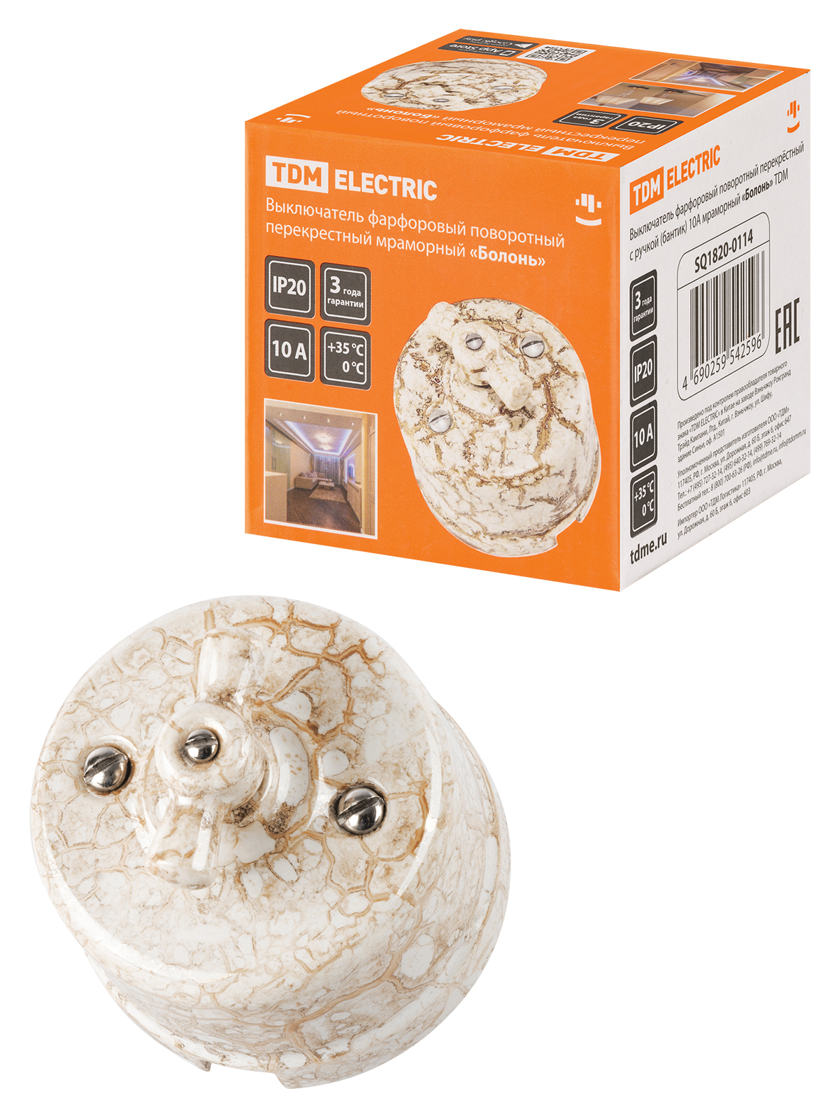 Наименование: Выключатель фарфоровый поворотный перекрёстный с ручкой (бантик) 10А мраморный «Болонь» TDM