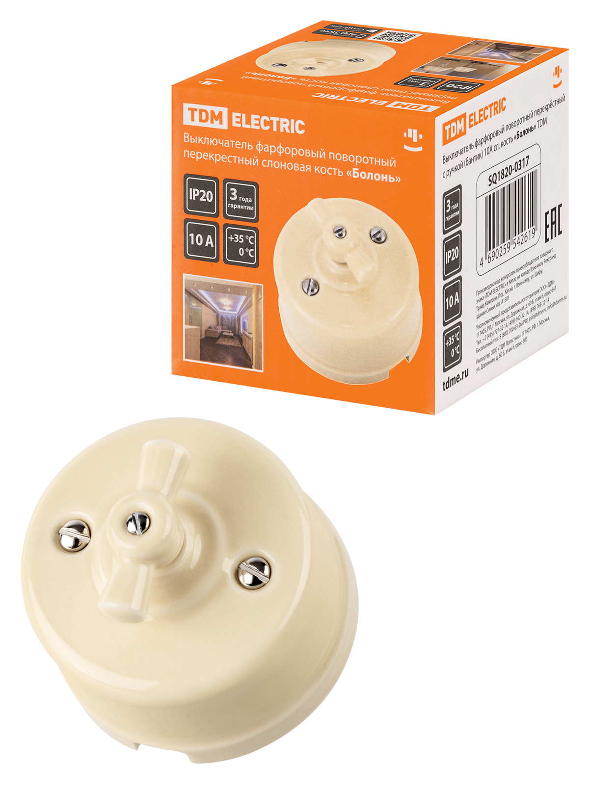 Наименование: Выключатель фарфоровый поворотный перекрёстный с ручкой (бантик) 10А сл. кость «Болонь» TDM