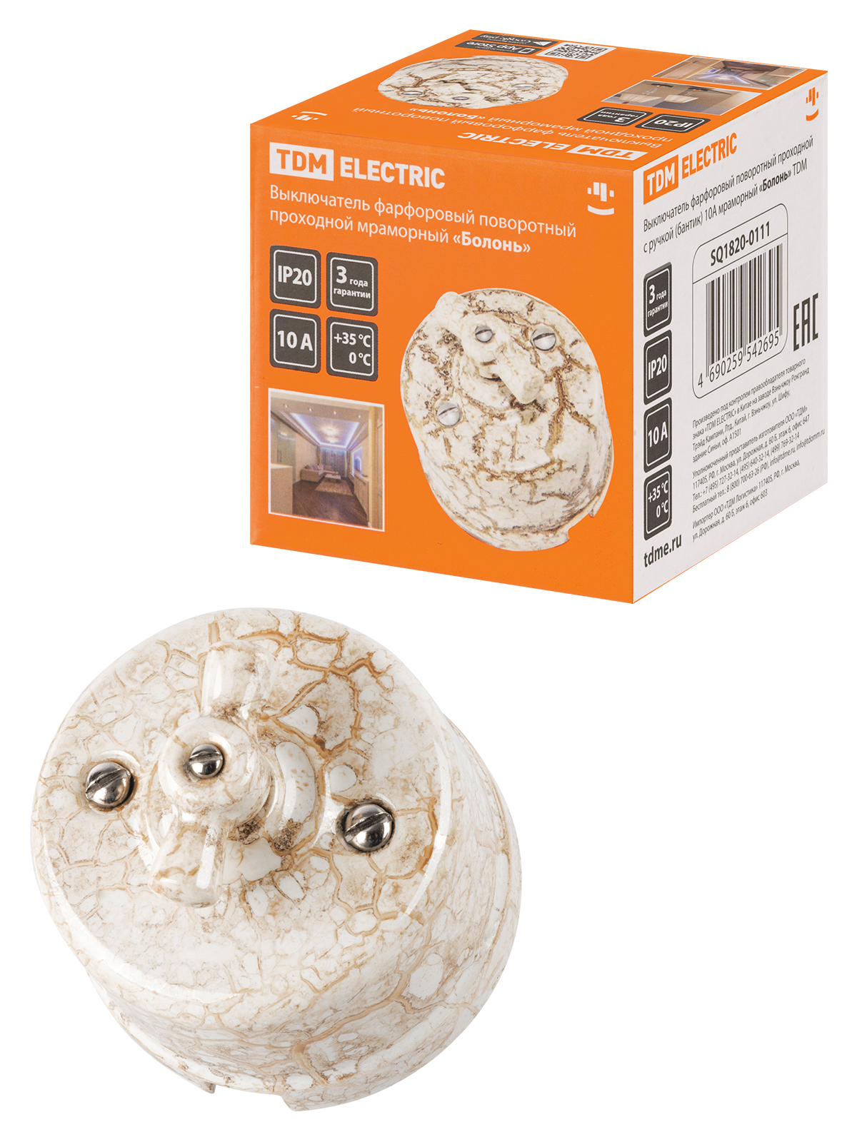 Наименование: Выключатель фарфоровый поворотный проходной с ручкой (бантик) 10А мраморный «Болонь» TDM