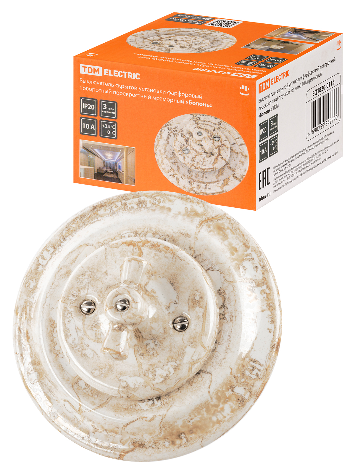 Наименование: Выключатель скрытой установки фарфоровый поворотный перекрёстный с ручкой (бантик) 10А мраморный «Бо
