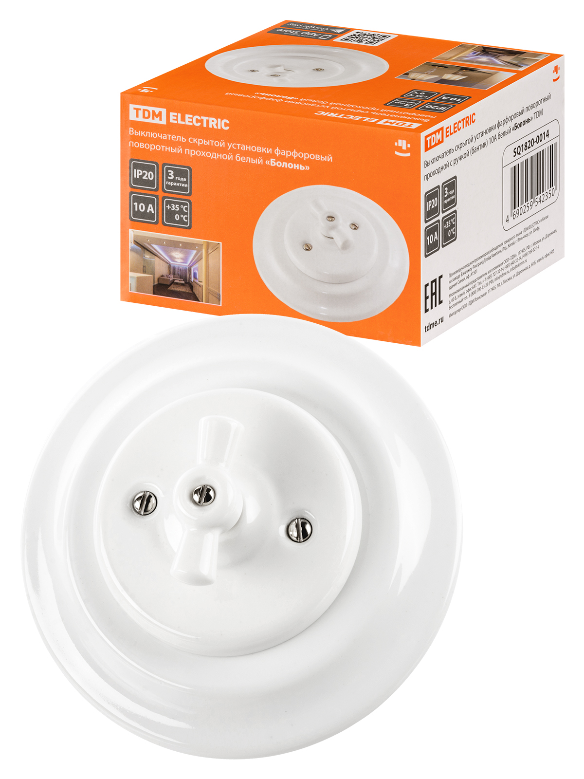 Наименование: Выключатель скрытой установки фарфоровый поворотный проходной с ручкой (бантик) 10А белый «Болонь» T