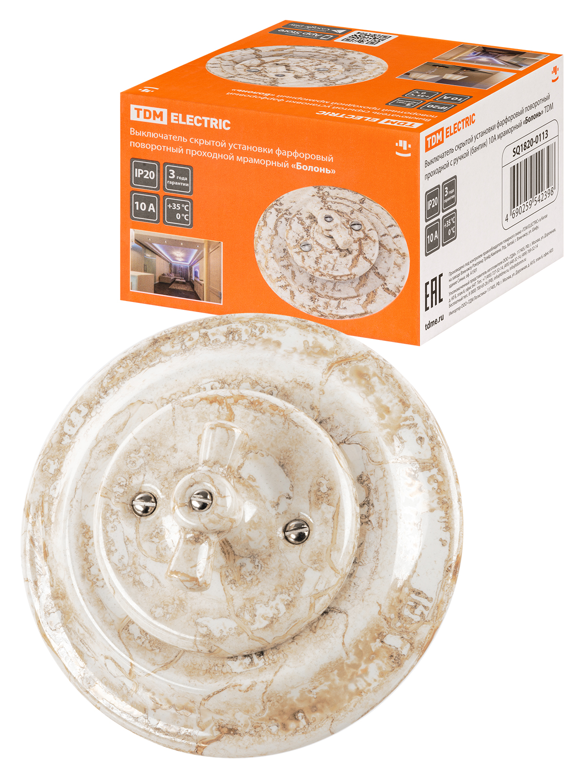 Наименование: Выключатель скрытой установки фарфоровый поворотный проходной с ручкой (бантик) 10А мраморный «Болон