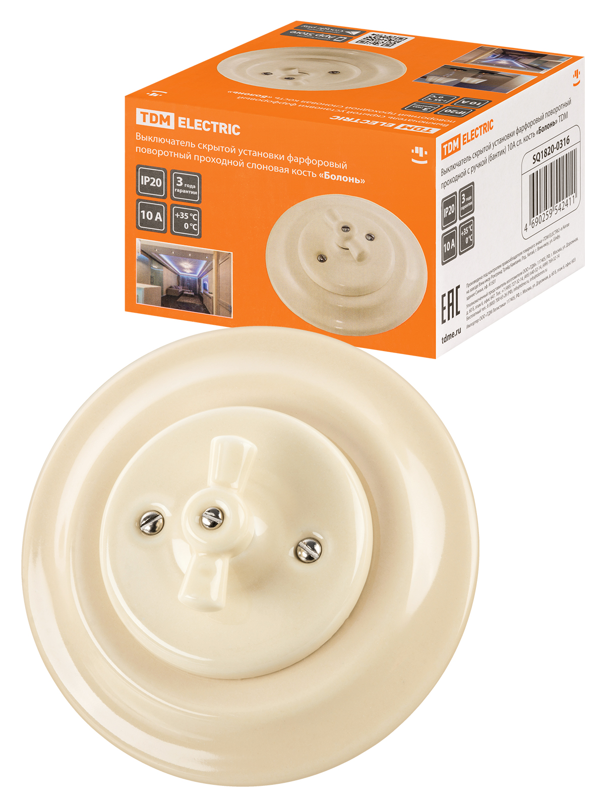 Наименование: Выключатель скрытой установки фарфоровый поворотный проходной с ручкой (бантик) 10А сл. кость «Болон
