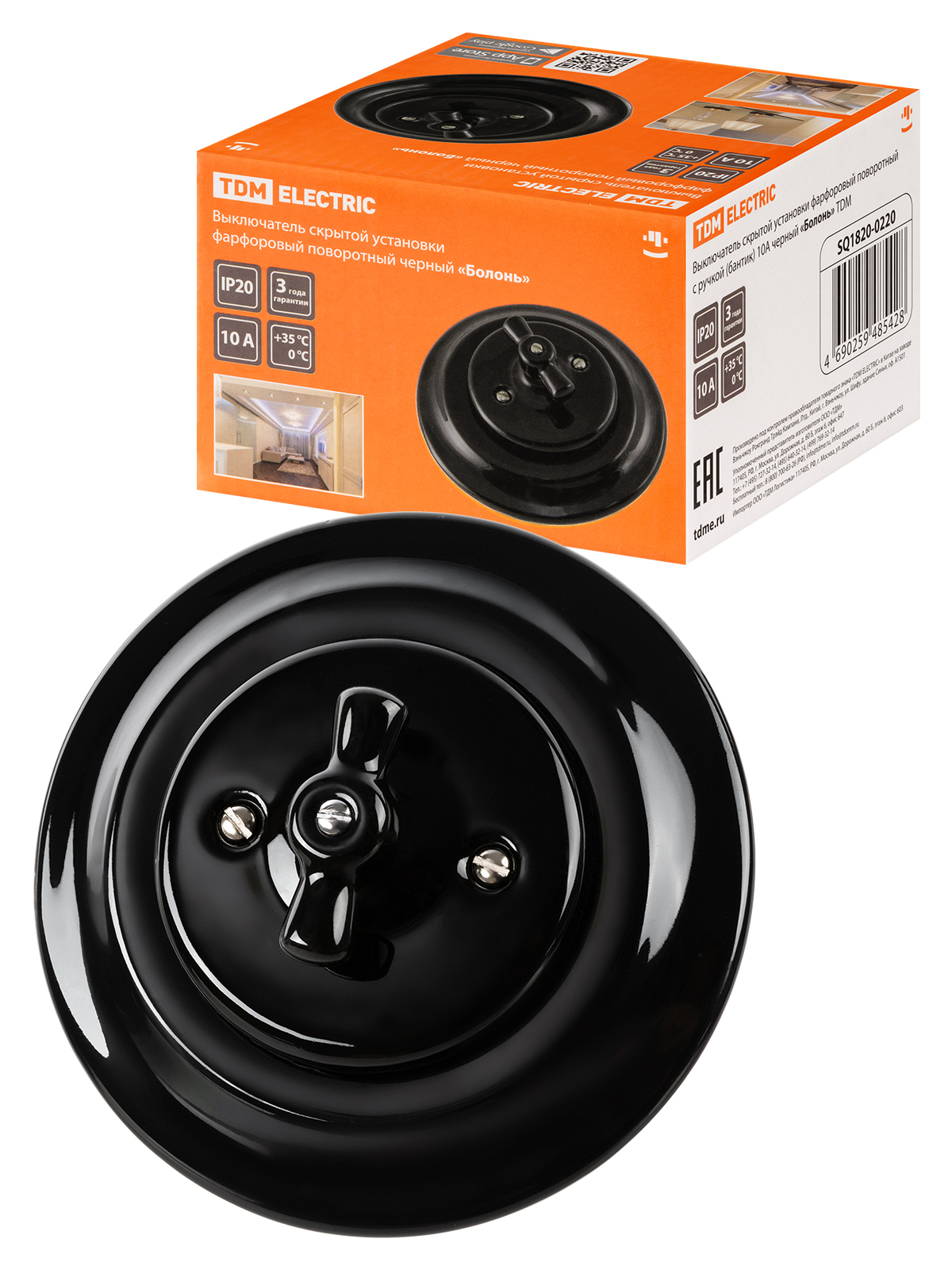 Наименование: Выключатель скрытой установки фарфоровый поворотный с ручкой (бантик) 10А черный «Болонь» TDM