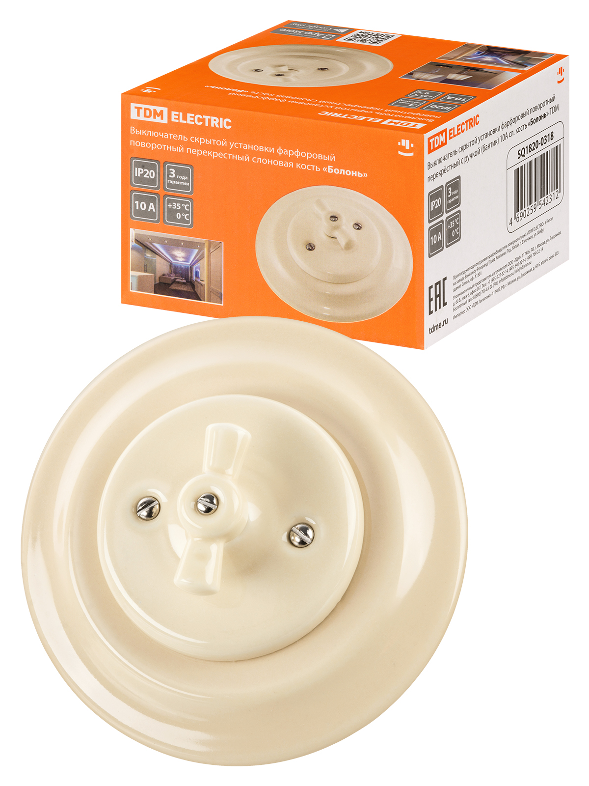 Наименование: Выключатель скрытой установки фарфоровый поворотный с ручкой (бантик) 10А сл. кость «Болонь» TDM