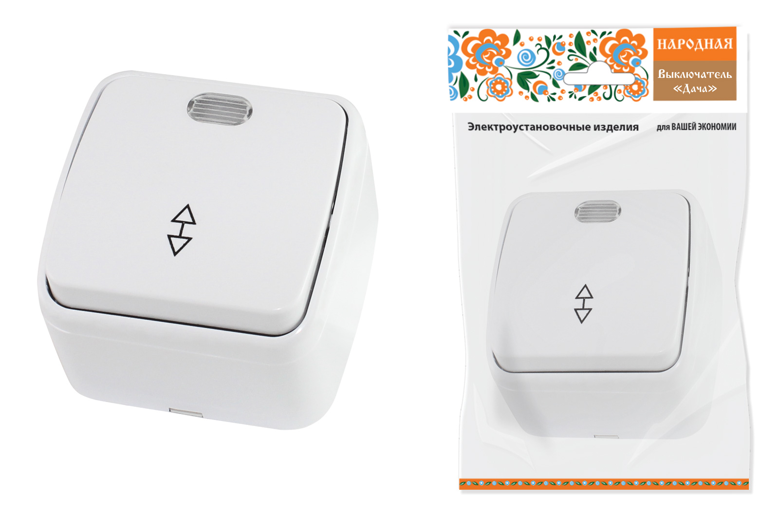 Наименование: Переключатель на 2 направления 1-кл. открытой установки с подсветкой IP20 10А, белый "Дача" Народная