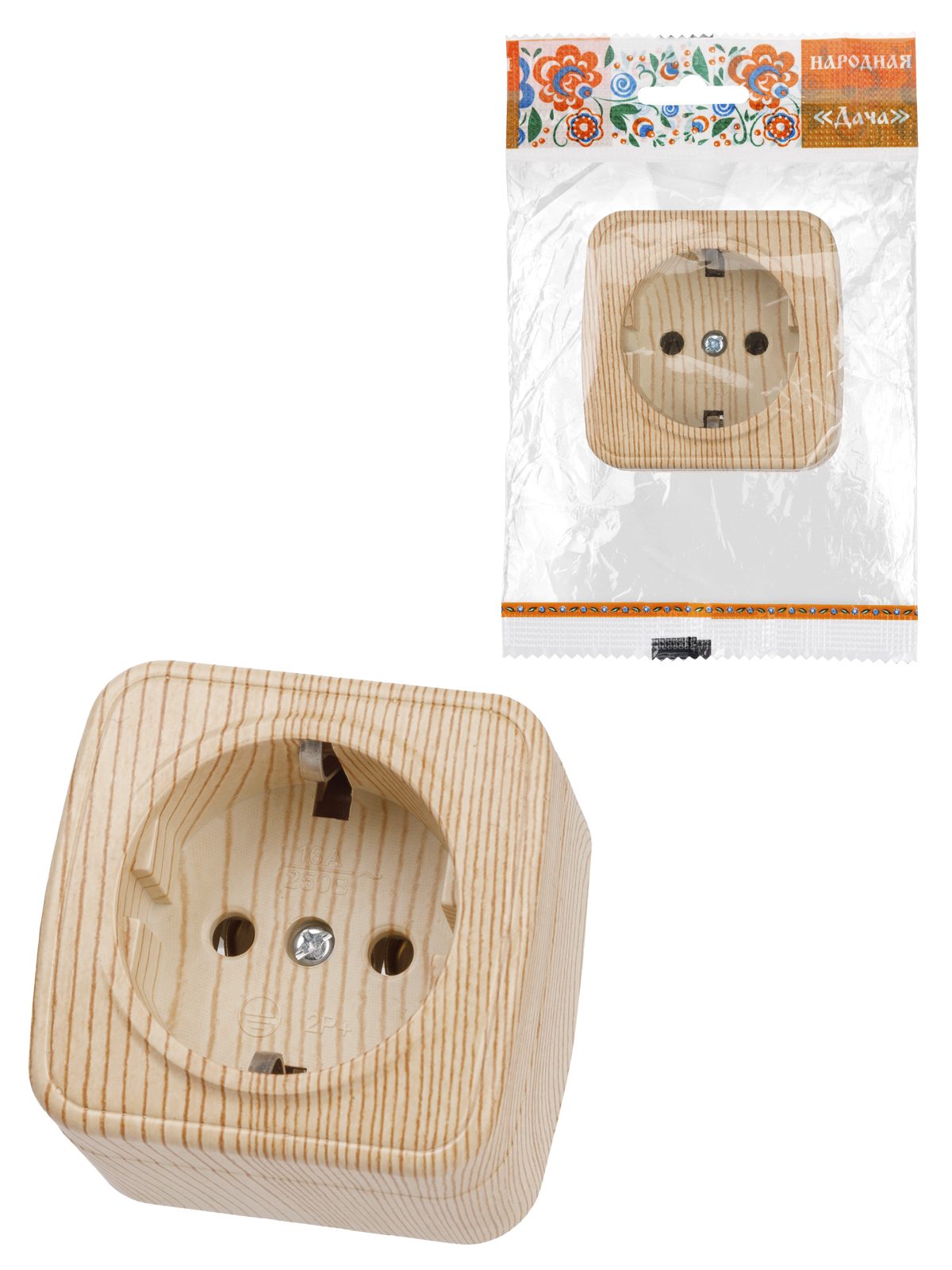 Наименование: Розетка 2П+З открытой установки IP20 16А, сосна "Дача" Народная