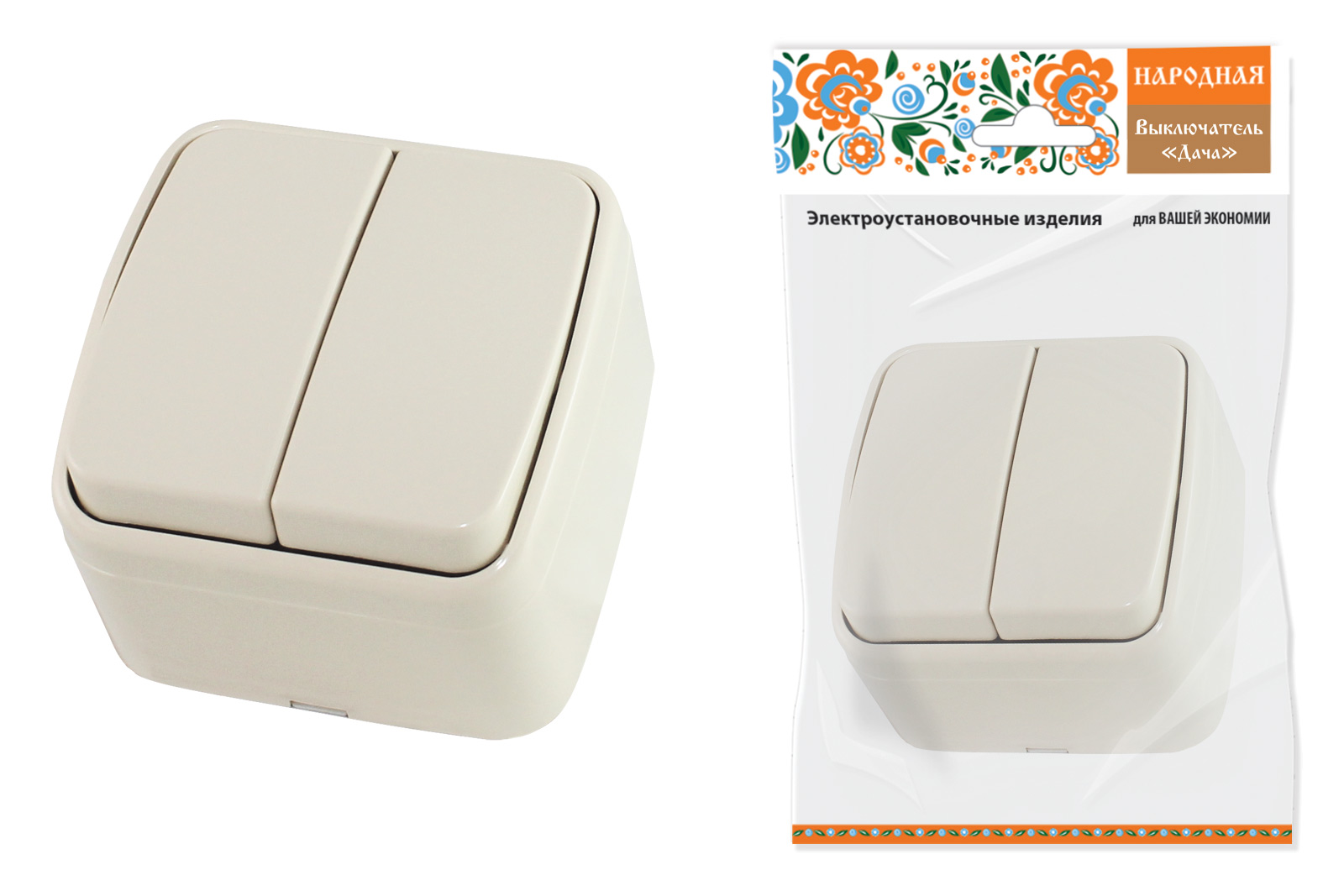 Наименование: Выключатель 2-кл. открытой установки IP20 10А, сл. кость "Дача" Народная