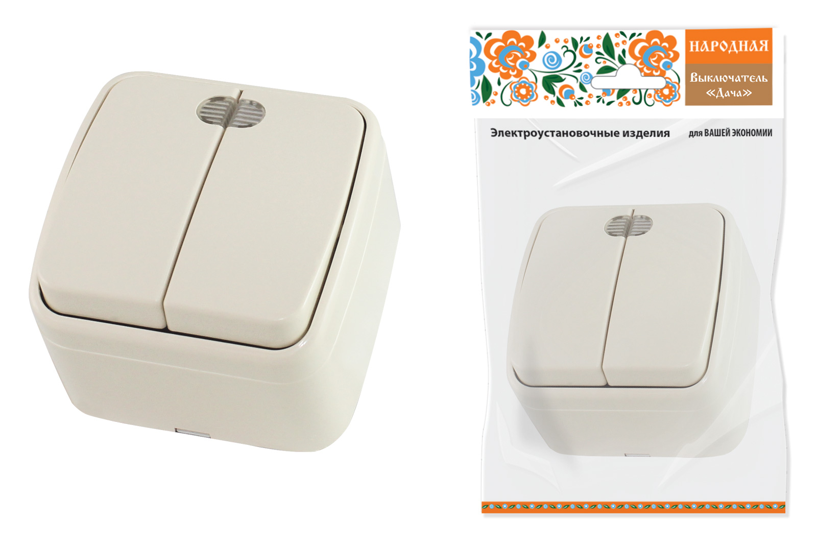 Наименование: Выключатель 2-кл. открытой установки с подсветкой IP20 10А, сл. кость "Дача" Народная