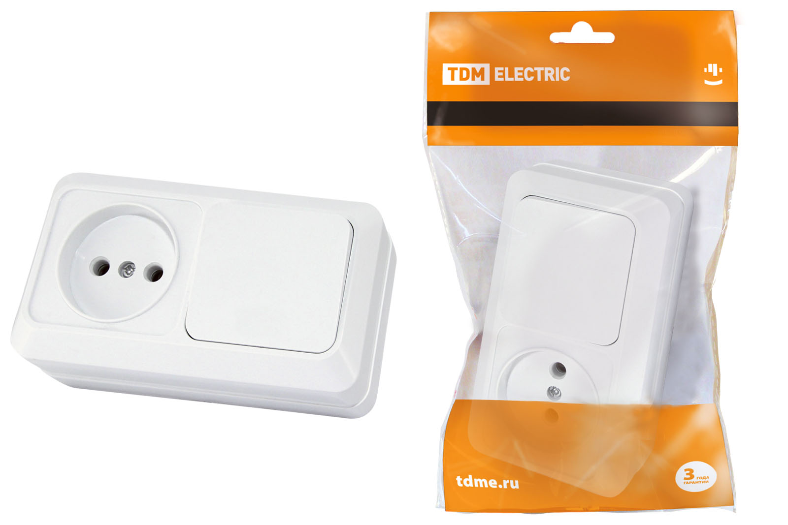 Наименование: Блок комбинированный выкл. 1-кл. 10А + розетка 2П 10А 250В БКВР IP20 белый "Ладога" TDM