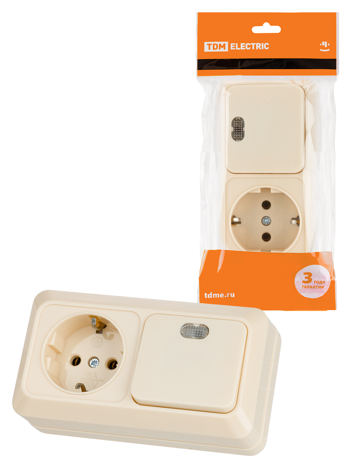 Наименование: Блок комбинированный выкл. 1-кл. с/п 10А + розетка 2П+З 16А 250В БКВР IP20 сл. кость "Ладога" TDM