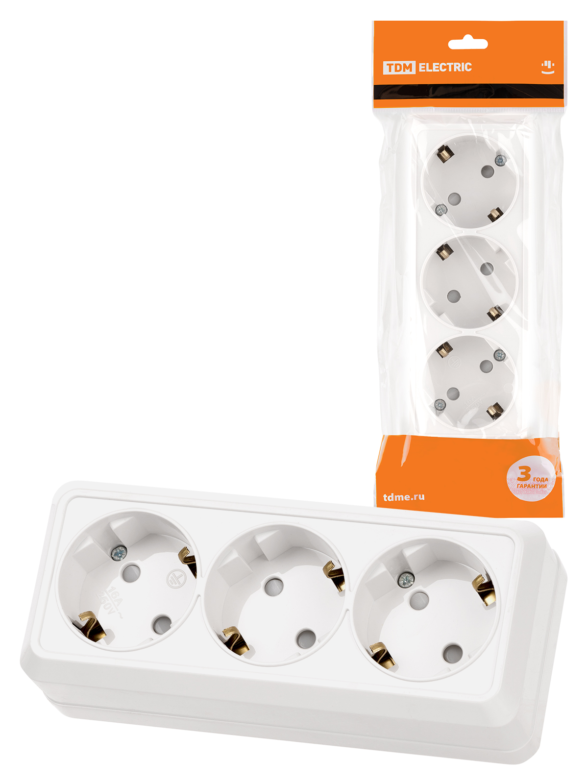 Наименование: Розетка 3-х местная горизонтальная 2П+3 открытой установки IP20 16A с з/ш белая "Ладога" TDM